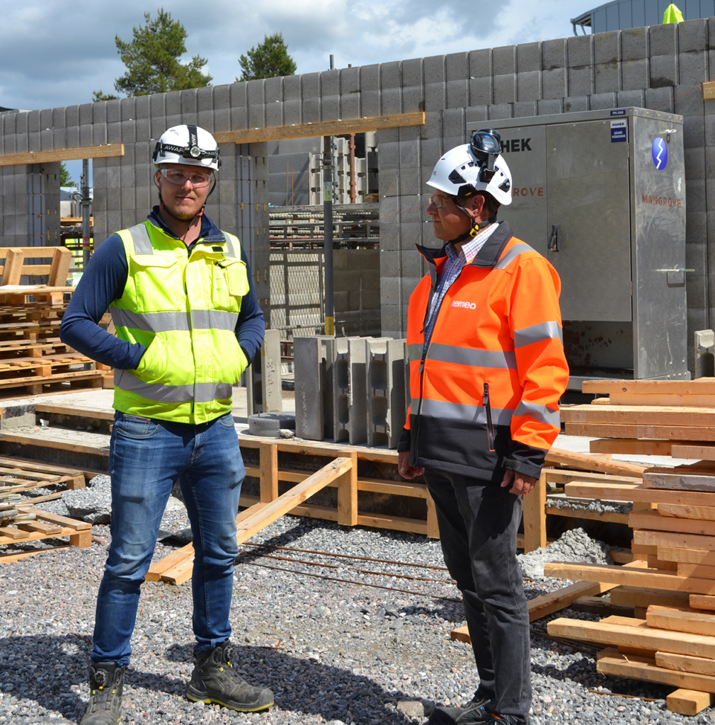 ”Yhdessä tehtiin jätehuoltosuunnitelma, joka on pitänyt. Olemme olleet oikein tyytyväisiä”, kertoo Hermanni Willman, Mangroven rakennustyömaan työnjohtaja. Mangroven yhteyshenkilönä Remeolta on ollut rakennusmyyjänä ja kiertotalouden parissa vuosia toiminut Timo Sariola, jonka kanssa suunnitelma yhdessä tehtiin ja jota kehitetään työmaan eri vaiheiden mukaan. ”Helpottaaksemme työmaan arkea mietittiin yhdessä, kuinka lajittelu voidaan toteuttaa järkevästi ja kustannustehokkaasti”, Timo summaa.