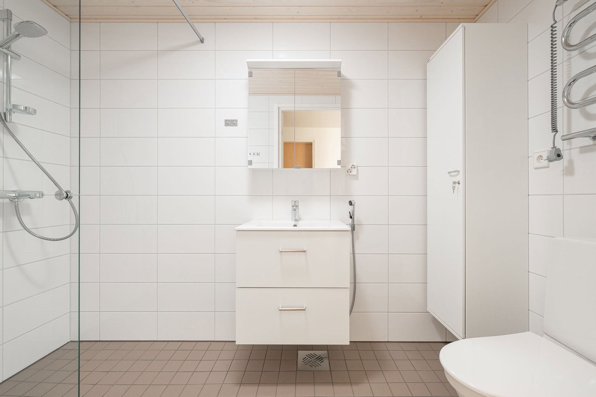 Materiaalivalinnat ovat ajattomia. Lattiapinnat ovat laminaattia, seinät ovat maalatut ja kylpyhuoneet laatoitetut. Ikkunoissa ja ikkunaovissa on sälekaihtimet, jotka tarjoavat mahdollisuuden säädellä valon määrää ja yksityisyyttä.