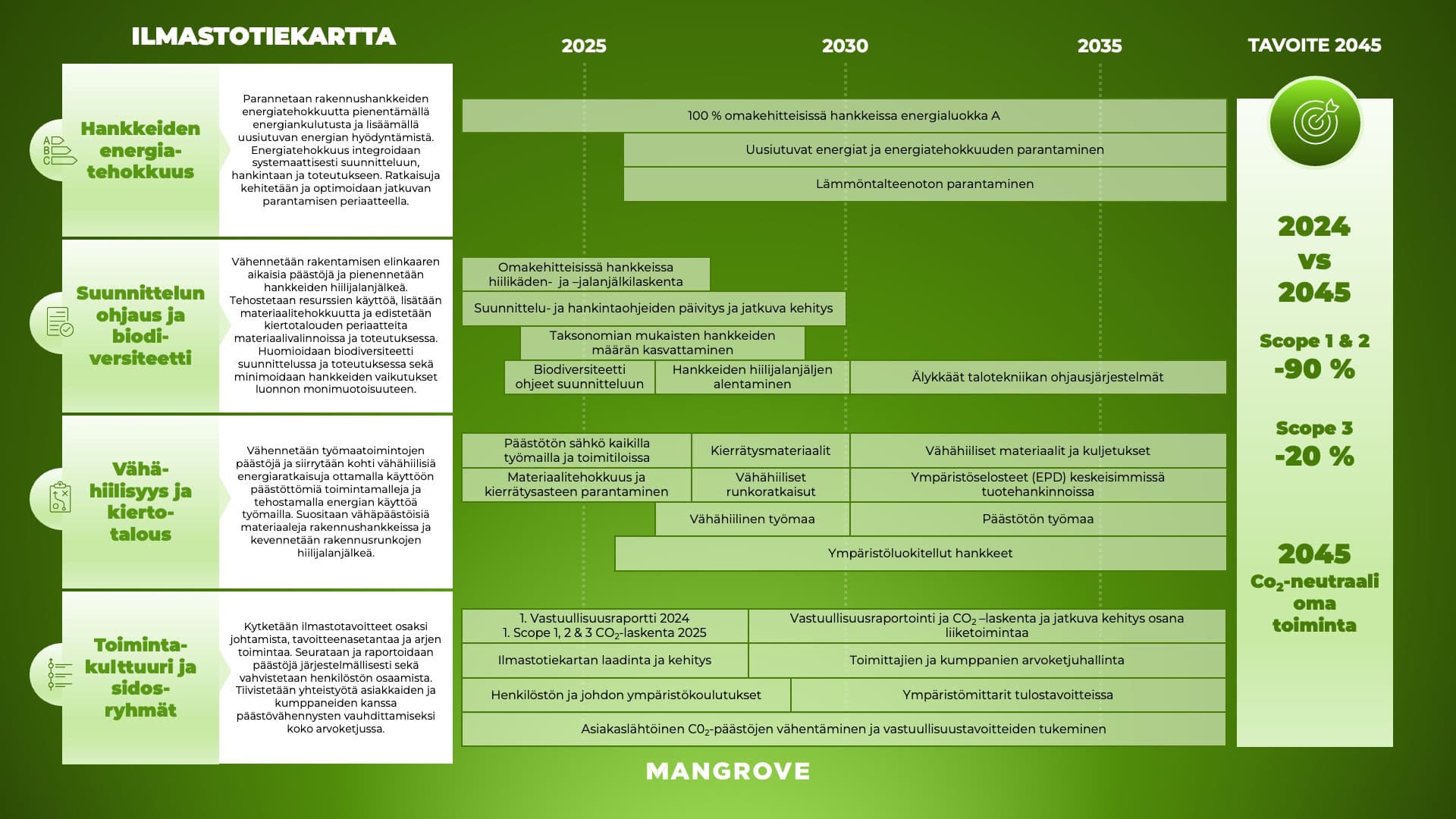 Vastuullisena rakentajana olemme sitoneet tavoitteemme Hiilineutraali Suomi 2045 -tavoitteisiin. Ilmastotyömme perustuu hiilitiekarttaan, joka ohjaa päästövähennystoimenpiteiden suunnittelua ja toteutusta. Tavoitteenamme on parantaa rakennushankkeiden energiatehokkuutta, lisätä uusiutuvan energian hyödyntämistä sekä pienentää rakentamisen hiilijalanjälkeä suunnittelun, materiaalivalintojen ja toteutuksen ratkaisuilla.