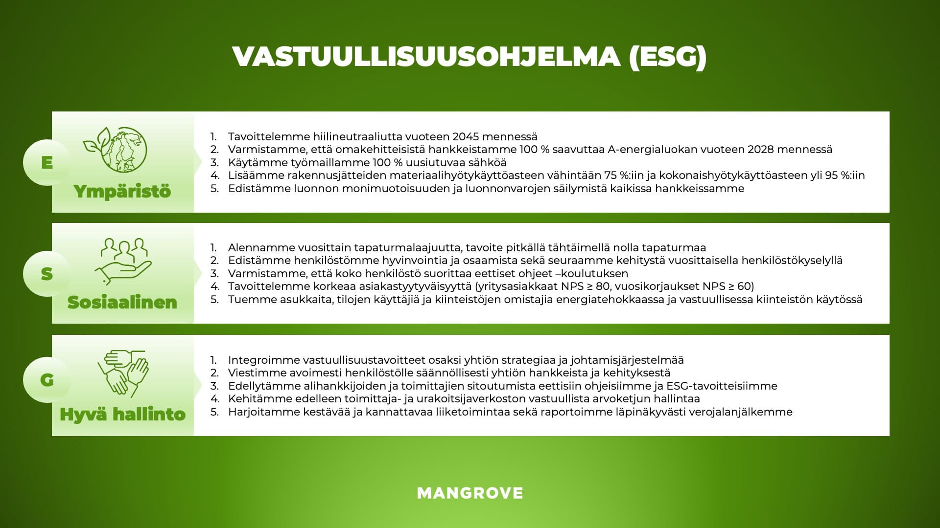 Ympäristövastuu on Mangroven strategian keskeinen painopiste. Sitoudumme vähähiiliseen ja resurssitehokkaaseen rakentamiseen sekä hiilijalanjäljen systemaattiseen pienentämiseen. Olemme asettaneet tavoitteeksemme hiilineutraaliuden vuoteen 2045 mennessä. Tavoite kattaa sekä oman toimintamme että hankkeidemme ilmastovaikutukset.